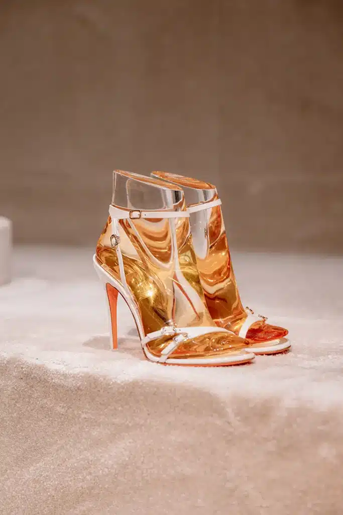 This conceptual framework was brought to life at Milan’s Galleria Meravigli, where Vitturi unveiled fifteen images and four sculptures commissioned by the Maison. In these works, Santoni’s signature materials, dyed Origine leather, sole leather, and Seta calfskin, are stitched and molded alongside blown Murano glass and Venetian beads, staging a compelling dialogue between distant crafts.